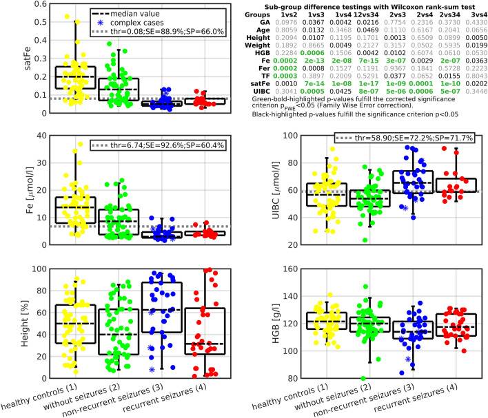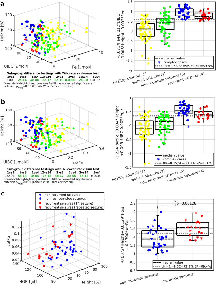 Our goal was to identify highly accurate empirical models for the prediction of the risk of febrile seizure (FS) and FS recurrence. In a prospective, three-arm, case-control study, we enrolled 162 children (age 25.8 ± 17.1 months old, 71 females). Participants formed one case group (patients with FS) and two control groups (febrile patients without seizures and healthy controls). The impact of blood iron status, peak body temperature, and participants' demographics on FS risk and recurrence was investigated with univariate and multivariate statistics. Serum iron concentration, iron saturation, and unsaturated iron-binding capacity differed between the three investigated groups (pFWE < 0.05). These serum analytes were key variables in the design of novel multivariate linear mixture models. The models classified FS risk with higher accuracy than univariate approaches. The designed bi-linear classifier achieved a sensitivity/specificity of 82%/89% and was closest to the gold-standard classifier. A multivariate model assessing FS recurrence provided a difference (pFWE < 0.05) with a separating sensitivity/specificity of 72%/69%. Iron deficiency, height percentile, and age were significant FS risk factors. In addition, height percentile and hemoglobin concentration were linked to FS recurrence. Novel multivariate models utilizing blood iron status and demographic variables predicted FS risk and recurrence among infants and young children with fever.