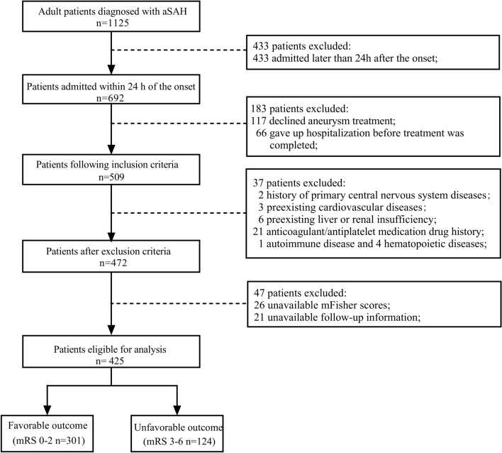 Methods: A total of 425 consecutive patients with aSAH at a single center were retrospectively enrolled in our study. An unfavorable outcome was defined as a modified Rankin Scale (mRS) score of 3-6 at 3 months after discharge. Univariate analysis and multivariable logistic regression were performed for baseline information and laboratory parameters recorded at admission. In addition, the receiver operating characteristic curve was plotted, and propensity score matching was performed based on the FPR.
