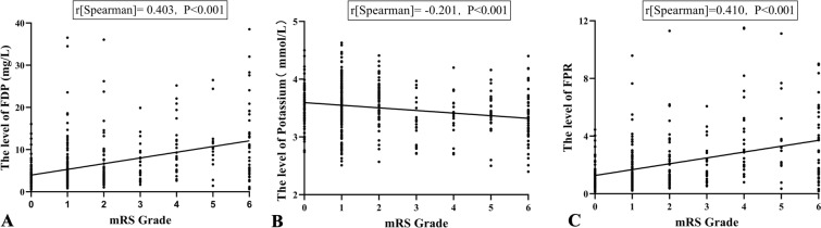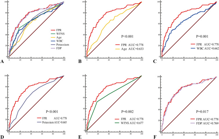 Results: On the basis of mRS grade, 301 patients were classified as having favorable outcomes, and 124 patients were assessed as having unfavorable outcomes. FPR levels were significantly correlated with mRS grade (r[Spearman] = 0.410; P < 0.001). Multivariate logistic regression analysis showed that age (odds ratio [OR] 1.043, 95% confidence interval [CI] 1.016-1.071; P = 0.002), white blood cell count (OR 1.150, 95% CI 1.044-1.267; P = 0.005), potassium (OR 0.526, 95% CI 0.291-0.949; P = 0.033), World Federation of Neurosurgical Societies grade (OR 1.276, 95% CI 1.055-1.544; P = 0.012), and FPR (OR 1.219, 95% CI 1.102-1.349; P < 0.001) at admission were independently associated with poor functional outcomes. The DeLong test showed that the area under the receiver operating characteristic curve of FPR was higher than that of age, white blood cell count, potassium, World Federation of Neurosurgical Societies grade, or FDP alone, indicating that FPR had better predictive potential than these other variables. After 1:1 propensity score matching (FPR ≥ 1.45 vs. FPR < 1.45), the rate of poor prognosis was still significantly increased in the high-FPR group (48/121 [39.7%] vs. 16/121 [13.2%], P < 0.001).