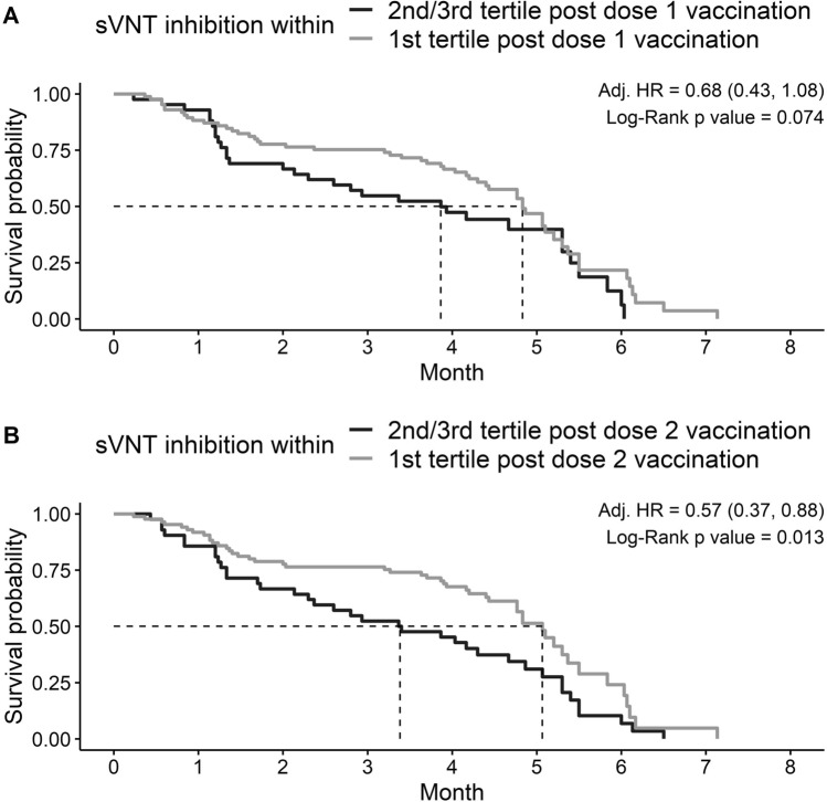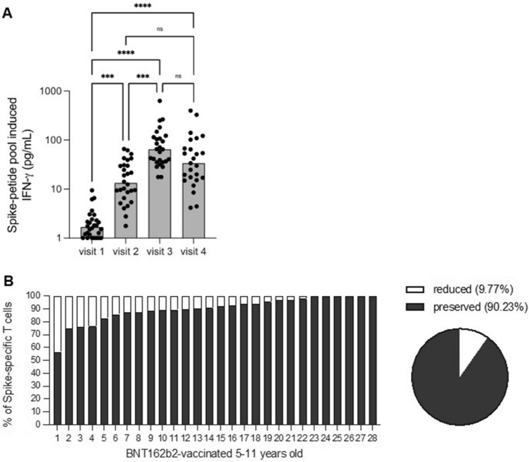 There is little information on BNT162b2 vaccine-induced variant-specific immunogenicity, safety data and dynamics of breakthrough infections in pediatric populations. We addressed these questions using a prospective two dose BNT162b2 (10 mcg) vaccination cohort study of healthy children 5-11 years in Singapore. Follow up included blood samples at scheduled visits, daily vaccination symptom diary and confirmation of SARS-CoV-2 infection. Surrogate virus neutralization test (sVNT) and spike-specific T cell responses against SARS-CoV-2 variants were performed. The mean age of 127 participants was 8.27 years (SD 1.95) and 51.2% were males. The median sVNT level against original variant after 1 dose and 2 dose vaccination was 61.4% and 95.1% respectively (p < 0.0001). Neutralizing antibodies against the Omicron variant was the lowest, median 22.4% (IQR 16.5-30.8). However, T cell IFN-γ cytokine response against Omicron variant was high and remained so about 4 months after vaccination. Fever rate increased significantly from 4% (dose 1) to 11.5% (dose 2). The risk of Omicron breakthrough infection decreased by 7.8% for every 1% increase in sVNT inhibition level measured after dose 2 vaccination. BNT162b2 vaccines were safe, induced good T cell responses but poor neutralizing antibodies against Omicron in children. Low neutralizing antibody levels post-vaccination was predictive of subsequent breakthrough infection.