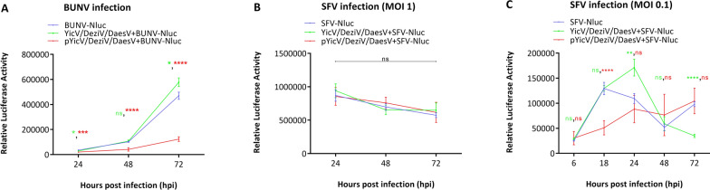Results: A strain of Yichang virus (Mesoniviridae) and two negeviruses (Daeseongdong virus and Dezidougou virus) were identified in the Cq. richiardii mosquitoes sampled in Germany, expanding current knowledge of their circulation in central Europe. Infection of mosquito-derived cells with these three viruses revealed that they are targeted by the small interfering RNA (siRNA) pathway. In Culex-derived cells, co-infection by these three viruses had varying effects on the representative arboviruses from different virus families (Togaviridae: Semliki forest virus [SFV]; Bunyavirales: Bunyamwera orthobunyavirus [BUNV]; or Flaviviridae: Usutu virus [USUV]). Specifically, persistent MSV co-infection inhibited BUNV infection, as well as USUV infection (but the latter only at specific time points). However, the impact on SFV infection was only noticeable at low multiplicity of infection (MOI 0.1) and at specific time points in combination with the infection status.