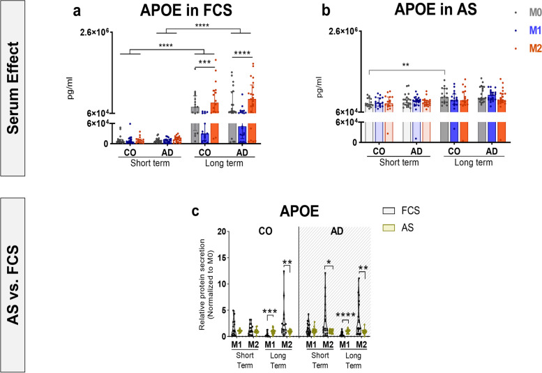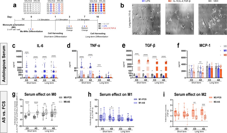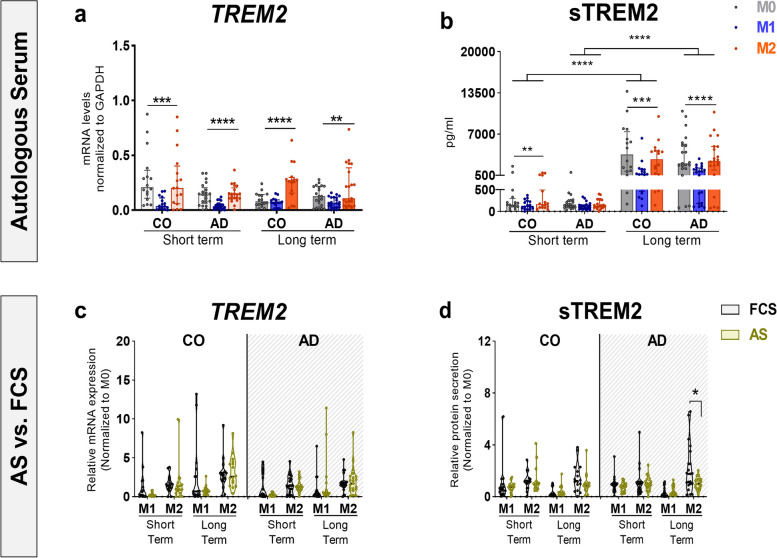 Objectives: To functionally assess patient-specific TREM2 and APOE synthesis, we designed a personalized assay based on Mo-MФs using monocytes from LOAD patients and matched controls (CO). We assessed the influence of each participant's own milieu, by examining the effect of short- (1 day) and long- (10 days) term differentiation of the cells in the presence of the donor´s autologous serum (AS) into M1-, M2- or M0-macrophages. Additionally, sex differences and Aβ-uptake ability in short- and long-term differentiated Mo-MФs were assessed.