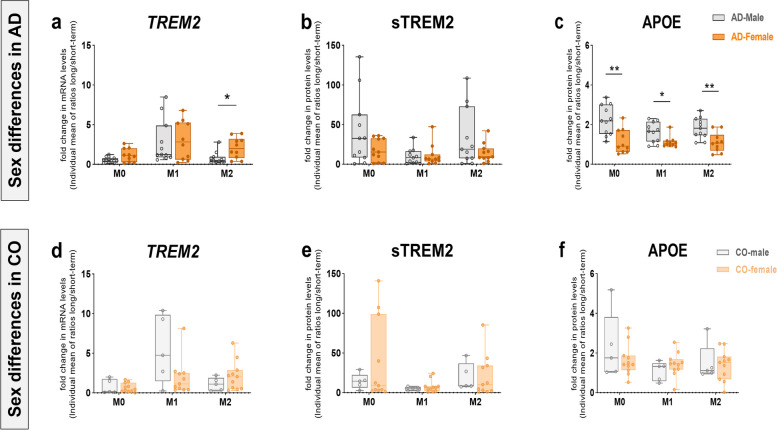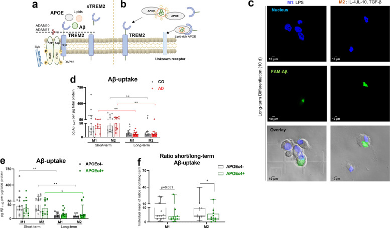 Results: We showed a time-dependent increase in TREM2 and APOE protein levels in LOAD- and CO-derived cells. While AS did not differentially modulate TREM2 compared to standard fetal calf serum (FCS), AS decreased APOE levels in M2 macrophages but increased levels in M1 macrophages. Interestingly, higher levels of TREM2 and lower levels of APOE were detected in female- than in male- LOAD patients. Finally, we report decreased Aβ-uptake in long-term differentiated CO- and LOAD-derived cells, particularly in APOEε4(+) carriers.