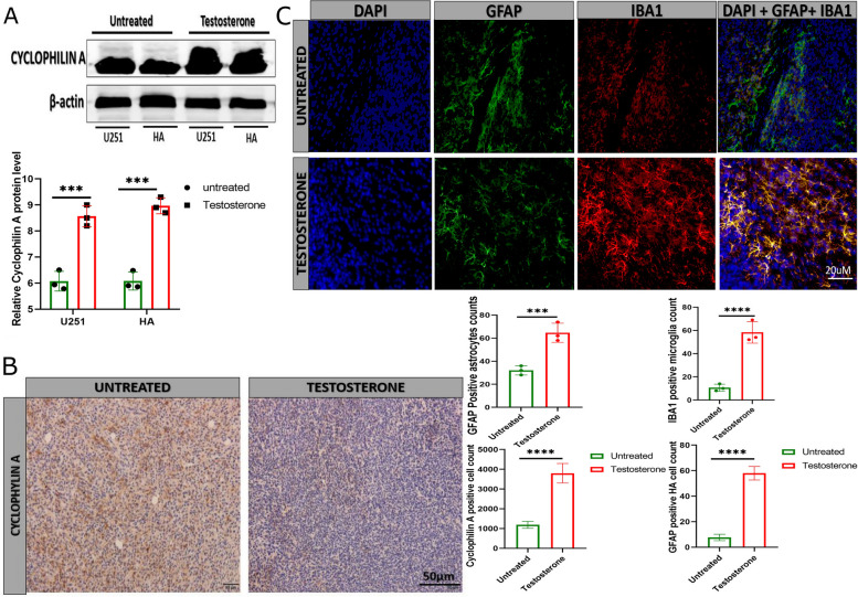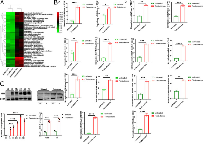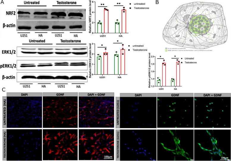 Results: Testosterone upregulates GDNF to stimulate proliferation, migration, and invasion of glioma cells. Pathologically, the augmentation of GDNF and cyclophilin A contributed to neuroprotection when treated with testosterone. Our investigation showed that testosterone contributes to brain neuron and astrocyte inflammation through the upregulation of nuclear factor erythroid 2-related factor 2 (NRF2), glial fibrillary acid protein (GFAP), and sirtuin 5 (SIRT5), resulting in pro-inflammatory macrophages recruitments into the neural microenvironment. Mechanically, testosterone treatment regulates GDNF translocation from the glioma cells and astrocyte nuclei to the cytoplasm.