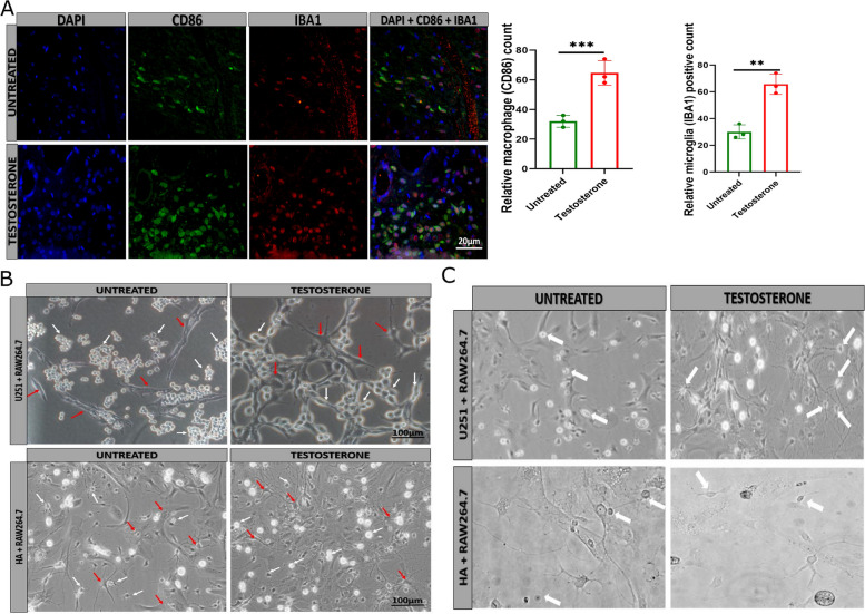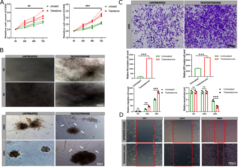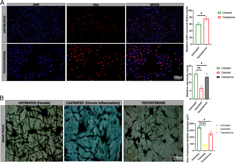 Background: Testosterone contributes to male organism development, such as bone density, muscle development, and fat repartition. Estrogen (derived from testosterone) also contributes to female reproductive system development. Here, we investigated the effect of testosterone on glioma cells and brain neuron inflammation essential for cancer development and progression.