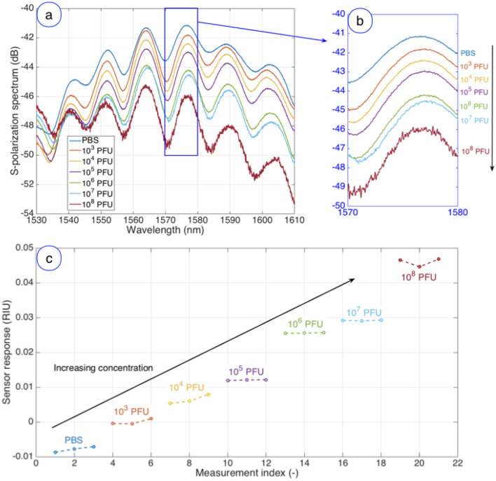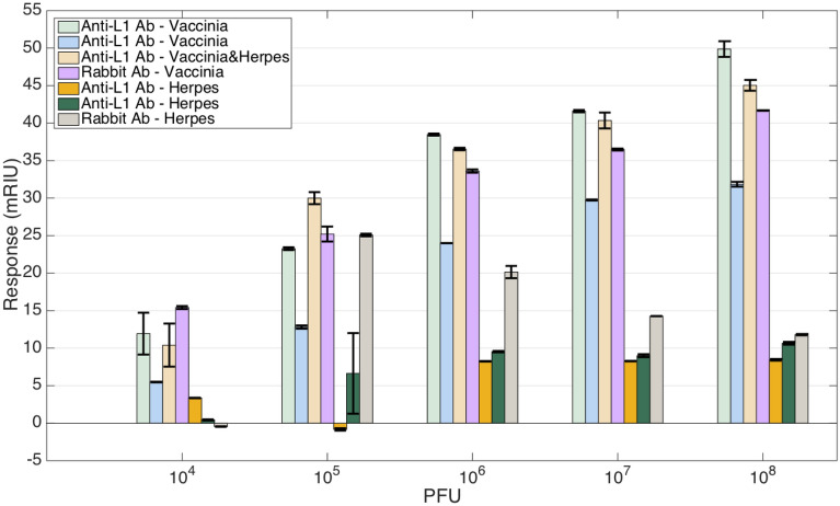 In this work, we present the development and biofunctionalization of a fiber-optic ball-resonator biosensor for the real-time detection of vaccinia poxvirus. We fabricated several ball-tip resonators, functionalized through a silanization process to immobilize two bioreceptors: the monoclonal anti-L1R antibody targeting the L1R protein, and the polyclonal rabbit serum antibodies targeting the whole vaccinia virus (VV) pathogen. Experimental measurements were carried out to detect VV in concentrations from 103 to 108 plaque-forming units (PFU), with a limit of detection of around 1.7-4.3 × 103 PFU and a log-quadratic pattern, with a response up to 5 × 10-4 RIU (refractive index units). The specificity was assessed against herpes simplex virus, used as a non-specific control, with the best results obtained with anti-L1R monoclonal antibodies, and through the detection of vaccinia virus/herpes simplex-1 combination. The obtained results provide a real-time viral recognition with a label-free sensing platform, having rapid response and ease of manufacturing, and paving the road to the seamless detection of poxviruses affecting different human and animal species using optical fibers.