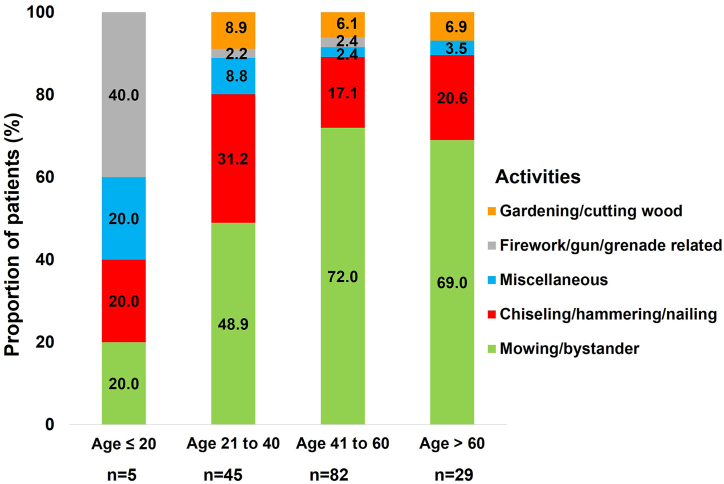 Results: A total of one hundred and sixty-one patients (162 eyes) were recruited. The patients had a mean (standard deviation) age of 47.6 (14.0) years with working male predominance (93.2%). The majority of patients were injured by activities related to grass trimming (63.4%) and metallic objects were the main materials causing injuries (75.7%). Following treatments, the proportion of eyes having vision worse than 20/400 decreased from 126 eyes (77.8%) to 55 eyes (33.9%) at final visit. Ocular trauma score (OTS) had a high potential prediction for final vision in eyes in OTS categories 4 and 5. However, the discordance of final visual acuity distribution was observed in some subgroups of eyes in OTS categories 1 to 3.
