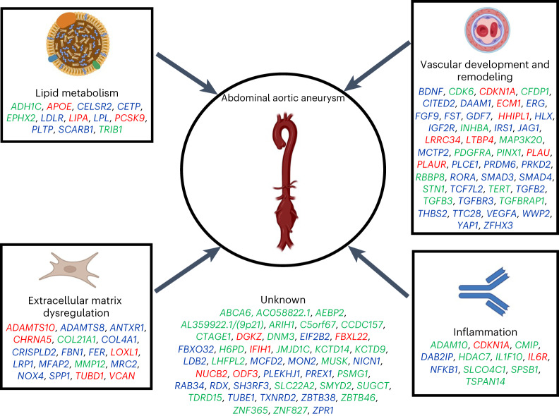Abdominal aortic aneurysm (AAA) is a common disease with substantial heritability. In this study, we performed a genome-wide association meta-analysis from 14 discovery cohorts and uncovered 141 independent associations, including 97 previously unreported loci. A polygenic risk score derived from meta-analysis explained AAA risk beyond clinical risk factors. Genes at AAA risk loci indicate involvement of lipid metabolism, vascular development and remodeling, extracellular matrix dysregulation and inflammation as key mechanisms in AAA pathogenesis. These genes also indicate overlap between the development of AAA and other monogenic aortopathies, particularly via transforming growth factor β signaling. Motivated by the strong evidence for the role of lipid metabolism in AAA, we used Mendelian randomization to establish the central role of nonhigh-density lipoprotein cholesterol in AAA and identified the opportunity for repurposing of proprotein convertase, subtilisin/kexin-type 9 (PCSK9) inhibitors. This was supported by a study demonstrating that PCSK9 loss of function prevented the development of AAA in a preclinical mouse model.