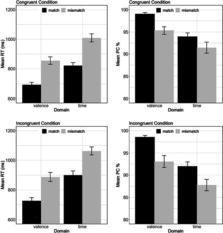 Five experiments investigated the association between time and valence. In the first experiment, participants classified temporal expressions (e.g., past, future) and positively or negatively connotated words (e.g., glorious, nasty) based on temporal reference or valence. They responded slower and made more errors in the mismatched condition (positive/past mapped to one hand, negative/future to the other) compared with the matched condition (positive/future to one hand, negative/past to the other hand). Experiment 2 confirmed the generalization of the match effect to nonspatial responses, while Experiment 3 found no reversal of this effect for left-handers. Overall, the results of the three experiments indicate a robust match effect, associating the past with negative valence and the future with positive valence. Experiment 4 involved rating the valence of time-related words, showing higher ratings for future-related words. Additionally, Experiment 5 employed latent semantic analysis and revealed that linguistic experiences are unlikely to be the source of this time-valence association. An interactive activation model offers a quantitative explanation of the match effect, potentially arising from a favorable perception of the future over the past.