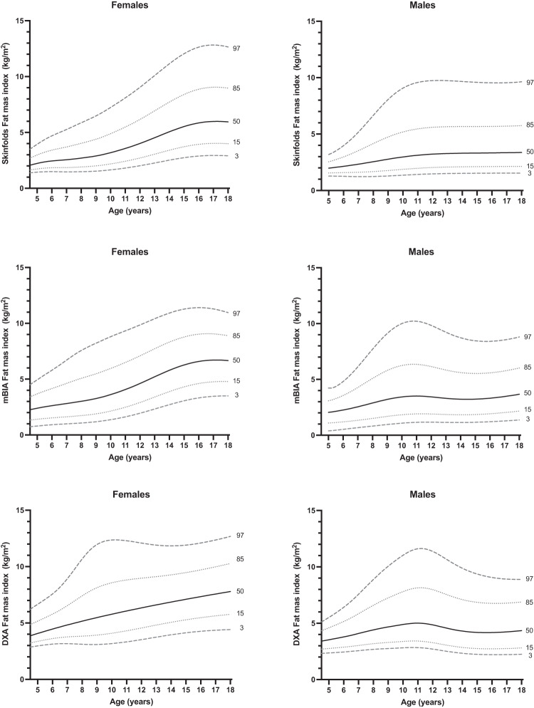 Results: We assessed 2104 subjects, and after confirming a clinically and metabolically healthy status, we measured 1659 subjects aged 5-20 years, [806 females (49%) and 853 males (51%)] by anthropometry, MF-BIA and DXA to create sex- and age- smoothed reference centiles, lambda (L), mu (M), and sigma (S) values. We also built sex- and age-smoothed graphic curves for each variable of interest.