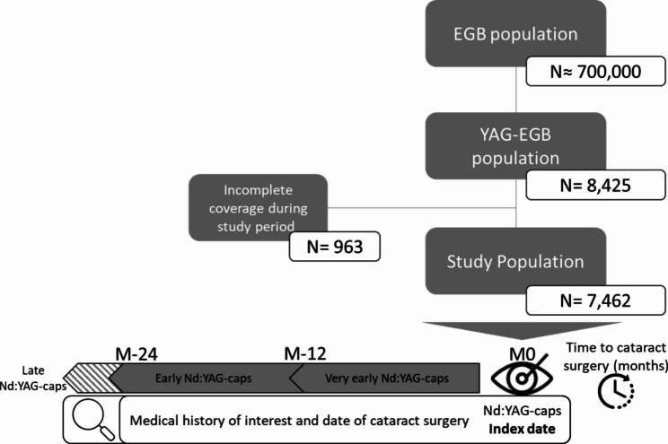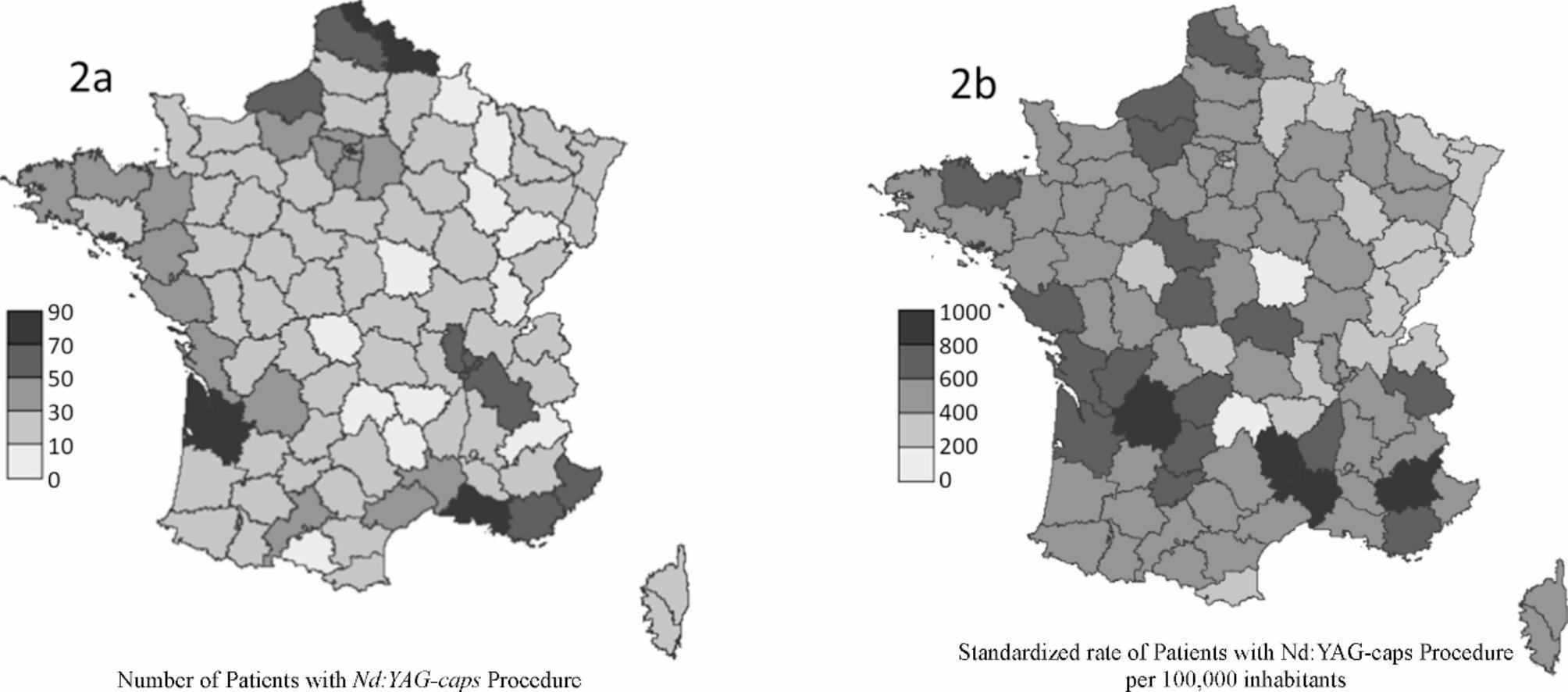 Results: During the study period, Nd:YAG-caps were performed in 8,425 patients accounting for 10,774 procedures. The extrapolation to the French population led to estimate that 253.103 patients had Nd:YAG-caps, representing 312.103 procedures in 2017. The mean age at Nd:YAG-caps was 75.1 (± 10.2) years. About 36% of patients presented at least one ocular comorbidity. Nd:YAG-caps was performed within 2 years after surgery in 33.0% of patients and within one year in 9.8% of patients. Patients with Nd:YAG-caps within the first year (OR CI95 0.721 [0.673-0.772]) or in the first two years (OR CI95 0.721 [0.673-0.772]) were younger than patients with later Nd:YAG-caps and had a more frequent history of treated ocular diseases (OR 1.516 and 1.178, respectively).