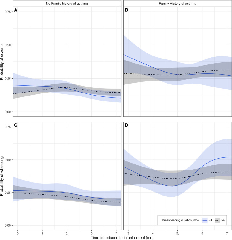 Results: Of the 7843 children included, the mean (standard deviation) age of introduction to infant cereal was 5.7 (1.9) months. There was evidence for family history of asthma and breastfeeding duration to be effect modifiers in the eczema (P = 0.04) and wheezing (P = 0.05) models. Introduction to infant cereal at 4 vs. 6 months of age was associated with higher odds of eczema (OR 1.62; 95% CI: 1.12, 2.35; P = 0.01) among children without a family history of asthma who were not breastfeeding when solid foods were introduced. Introduction to infant cereal at 4 vs. 6 months of age was associated with a higher odds of wheezing (OR 1.31; 95% CI: 1.13, 1.52; P < .001) among children without a family history of asthma who were breastfeeding when solid foods were introduced. There was little evidence of an association among the remaining strata for either outcome.