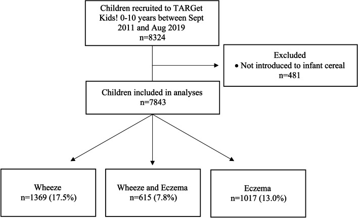 Methods: A longitudinal cohort study with repeated measures was conducted among children from birth to 10 years of age who were participating in the TARGet Kids! practice based research network in Toronto, Canada. The primary exposure was the timing of introduction to infant cereal as the first solid food. The primary outcome was eczema and the secondary outcome was wheezing collected by parent report using the validated International Study of Asthma and Allergies in Childhood (ISAAC) questionnaire. Multinomial generalized estimating equations were used and effect modification by family history of asthma and breastfeeding duration were explored.
