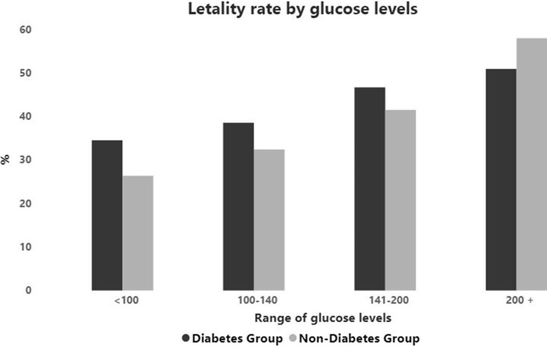 Results: DM group (n = 1218) differed from Non-DM group (n = 2109) by higher age, body mass index (BMI), systolic blood pressure and lower O2 saturation on admission. Gender, ethnicity and COVID-19-related symptoms were similar. Glucose and several markers of inflammation, tissue injury and organ dysfunction were higher among patients with diabetes: troponin, lactate dehydrogenase, creatine phosphokinase (CPK), C-reactive protein (CRP), lactate, brain natriuretic peptide, urea, creatinine, sodium, potassium but lower albumin levels. Hospital (12 × 11 days) and intensive care unit permanence (10 × 9 days) were similar but DM group needed more vasoactive, anticoagulant and anti-platelet drugs, oxygen therapy, endotracheal intubation and dialysis. Lethality was higher in patients with diabetes (39.3% × 30.7%) and increased with glucose levels and age, in male sex and with BMI < 30 kg/m2 in both groups (obesity paradox). It was lower with previous treatment with ACEi/BRA in both groups. Ethnicity and education level did not result in different outcomes between groups. Higher frequency of comorbidities (hypertension, cardiovascular/renal disease, stroke), of inflammatory (higher leucocyte number, RCP, LDH, troponin) and renal markers (urea, creatinine, potassium levels and lower sodium, magnesium) differentiated lethality risk between patients with and without diabetes.
