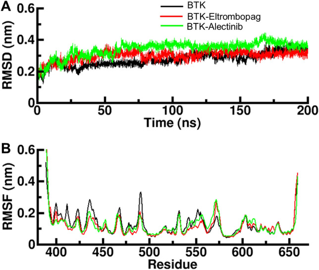Bruton's tyrosine kinase (BTK) is a non-receptor protein kinase that plays a crucial role in various biological processes, including immune system function and cancer development. Therefore, inhibition of BTK has been proposed as a therapeutic strategy for various complex diseases. In this study, we aimed to identify potential inhibitors of BTK by using a drug repurposing approach. To identify potential inhibitors, we performed a molecular docking-based virtual screening using a library of repurposed drugs from DrugBank. We then used various filtrations followed by molecular dynamics (MD) simulations, principal component analysis (PCA), and Molecular Mechanics Poisson Boltzmann Surface Area (MM-PBSA) analysis to further evaluate the binding interactions and stability of the top-ranking compounds. Molecular docking-based virtual screening approach identified several repurposed drugs as potential BTK inhibitors, including Eltrombopag and Alectinib, which have already been approved for human use. All-atom MD simulations provided insights into the binding interactions and stability of the identified compounds, which will be helpful for further experimental validation and optimization. Overall, our study demonstrates that drug repurposing is a promising approach to identify potential inhibitors of BTK and highlights the importance of computational methods in drug discovery.