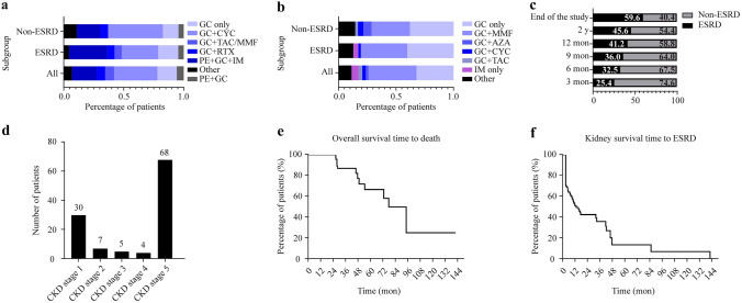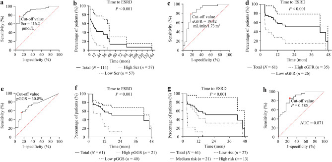Results: Renal involvement was the most typical manifestation (95.5%), and the crescent was the predominant pathological lesion (84.9%). The estimated glomerular filtration rate (eGFR) was evaluated in 114 patients, of whom 59.6% developed ESRD, and the median time to ESRD was 3.20 months. The eGFR [P = 0.006, odds ratio (OR) = 0.955, 95% confidence interval (CI) = 0.924-0.987] and the percentages of global glomerulosclerosis (pGGS; P = 0.018, OR = 1.060, 95% CI = 1.010-1.112) were independent risk factors for ESRD of renal biopsy. Based on the pGGS and eGFR at renal biopsy, we developed three risk grades of ESRD and one predictive model. The Kaplan‒Meier curve indicated that renal outcomes were significantly different in different risk grades (P < 0.001). Compared with serum creatinine at baseline, the predictive model had higher accuracy (0.86 versus 0.58, P < 0.001) and a lower coefficient of variation (0.07 versus 0.92) in external validation.
