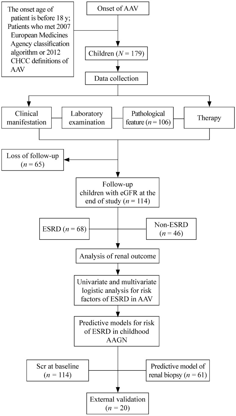 Methods: Data from 179 AAV children in multiple centers between January 2012 and March 2020 were collected retrospectively. The risk factors and predictive model of end-stage renal disease (ESRD) in AAV were explored.