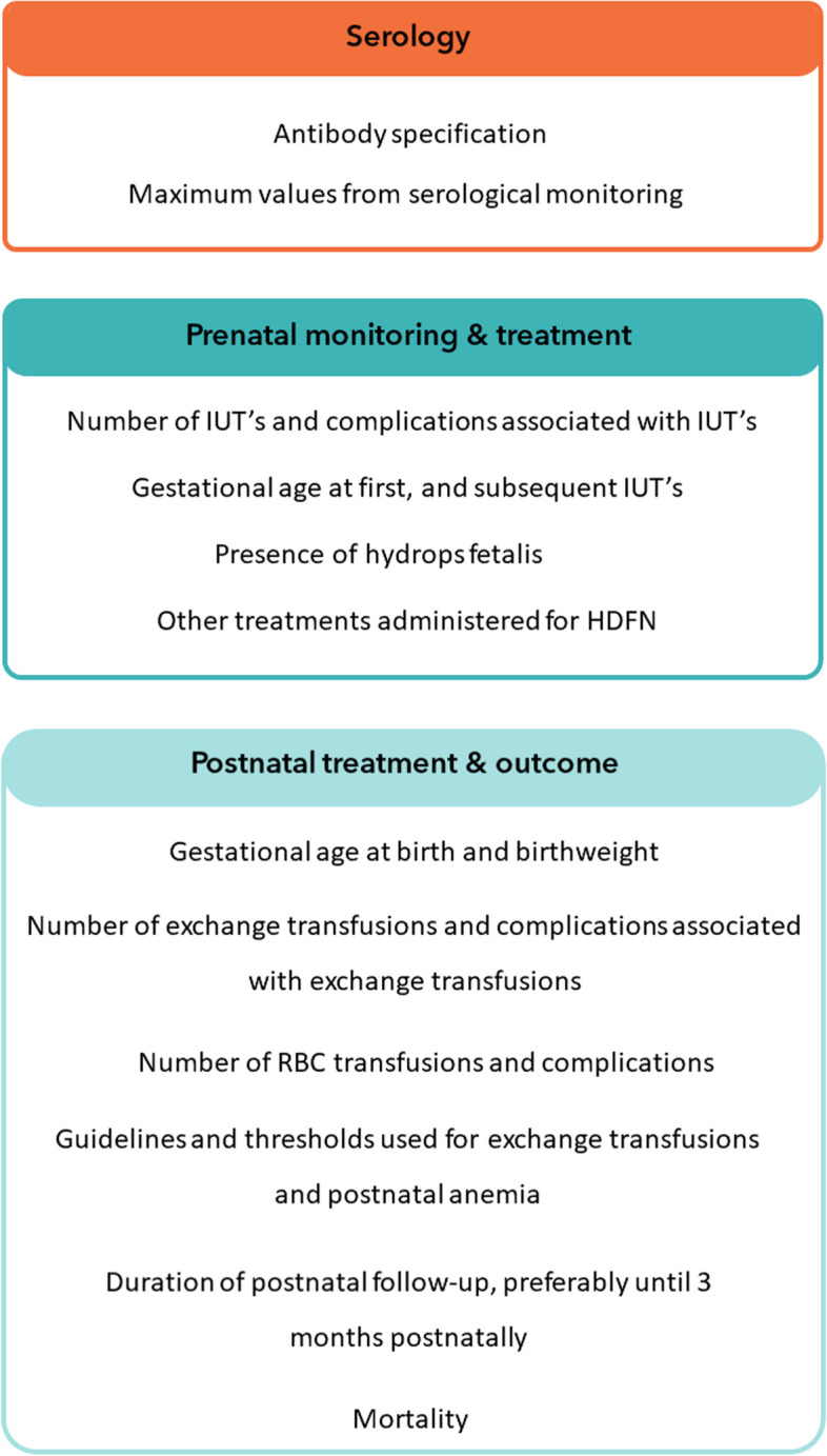 Background: Advances in postnatal care for hemolytic disease of the fetus and newborn (HDFN) have occurred over the past decades, but little is known regarding the frequency of postnatal treatment and the clinical outcomes of affected neonates. Most studies reporting on HDFN originate from high-income countries or relatively large centers, but important differences between centers and countries may exist due to differences in prevalence and available treatment options. We therefore aimed to evaluate the postnatal treatment landscape and clinical outcomes in neonates with Rhesus factor D (Rh(D))- and/or K-mediated HDFN and to provide recommendations for future research.