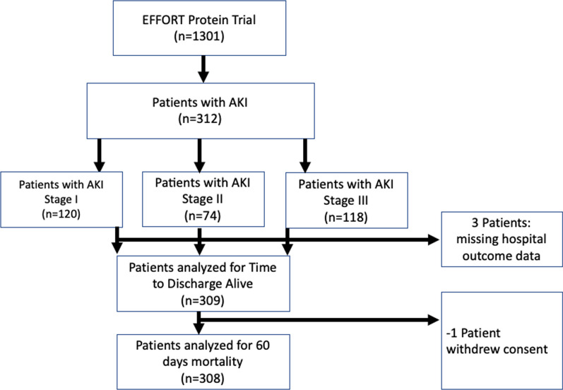 Methods: In this post hoc analysis of the EFFORT Protein trial, we investigated the effect of high versus usual protein dose (≥ 2.2 vs. ≤ 1.2 g/kg body weight/day) on time-to-discharge alive from the hospital (TTDA) and 60-day mortality and in different subgroups in critically ill patients with AKI as defined by the Kidney Disease Improving Global Outcomes (KDIGO) criteria within 7 days of ICU admission. The associations of protein dose with incidence and duration of kidney replacement therapy (KRT) were also investigated.
