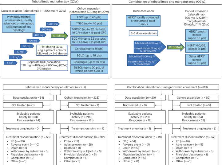 Tebotelimab, a bispecific PD-1×LAG-3 DART molecule that blocks both PD-1 and LAG-3, was investigated for clinical safety and activity in a phase 1 dose-escalation and cohort-expansion clinical trial in patients with solid tumors or hematologic malignancies and disease progression on previous treatment. Primary endpoints were safety and maximum tolerated dose of tebotelimab when administered as a single agent (n = 269) or in combination with the anti-HER2 antibody margetuximab (n = 84). Secondary endpoints included anti-tumor activity. In patients with advanced cancer treated with tebotelimab monotherapy, 68% (184/269) experienced treatment-related adverse events (TRAEs; 22% were grade ≥3). No maximum tolerated dose was defined; the recommended phase 2 dose (RP2D) was 600 mg once every 2 weeks. There were tumor decreases in 34% (59/172) of response-evaluable patients in the dose-escalation cohorts, with objective responses in multiple solid tumor types, including PD-1-refractory disease, and in LAG-3+ non-Hodgkin lymphomas, including CAR-T refractory disease. To enhance potential anti-tumor responses, we tested margetuximab plus tebotelimab. In patients with HER2+ tumors treated with tebotelimab plus margetuximab, 74% (62/84) had TRAEs (17% were grade ≥3). The RP2D was 600 mg once every 3 weeks. The confirmed objective response rate in these patients was 19% (14/72), including responses in patients typically not responsive to anti-HER2/anti-PD-1 combination therapy. ClinicalTrials.gov identifier: NCT03219268 .