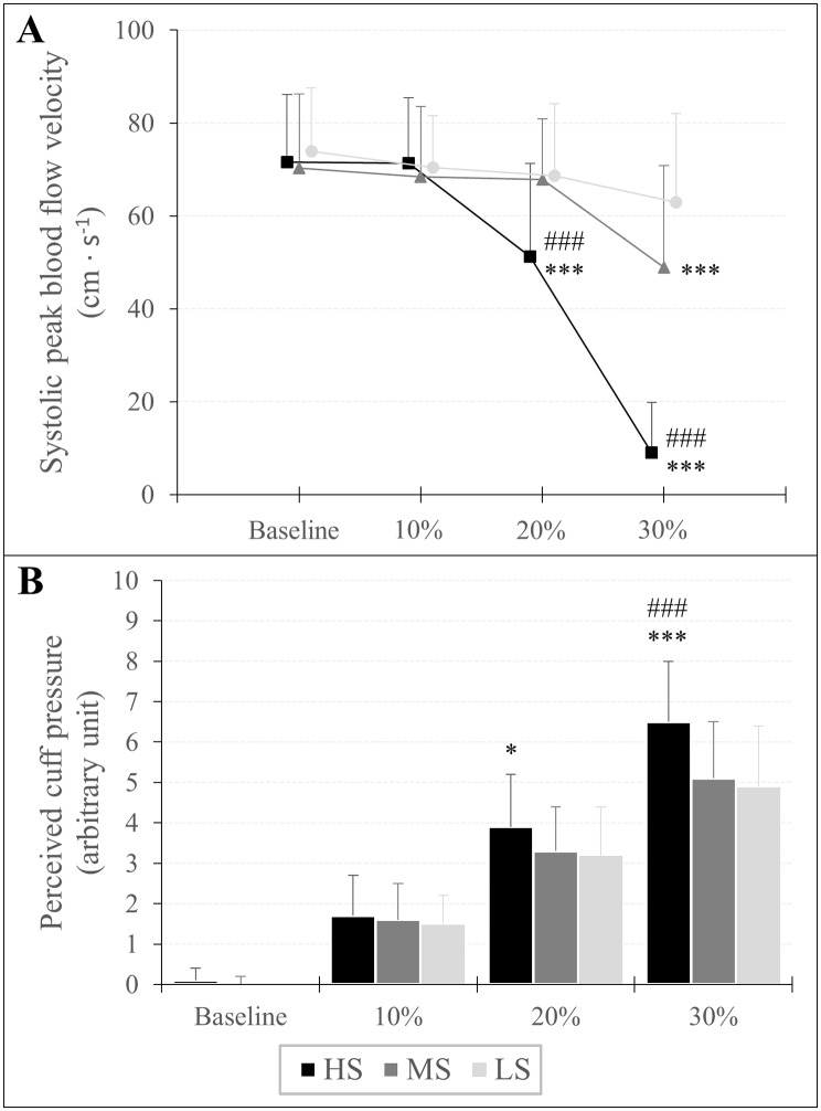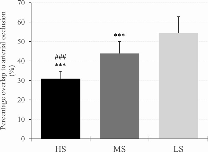 Results: The %overlap required to occlude arterial blood flow was different between the three cuffs (HS: 30.9 ± 3.8%, MS: 43.9 ± 6.1%, LS: 54.5 ± 8.3%). Furthermore, at 30% overlap, systolic peak blood flow velocity was lower when applying the HS (9.0 ± 10.9 cm∙s- 1) compared to MS (48.9 ± 21.9 cm∙s- 1) and LS cuff (62.9 ± 19.1 cm∙s- 1). Rating of perceived cuff pressure at 30% overlap was higher when using the HS (6.5 ± 1.5 arbitrary unit (a.u.)) compared to MS (5.1 ± 1.4 a.u.) and LS cuff (4.9 ± 1.5 a.u.) with no difference between the MS and LS cuff. However, muscle oxygen saturation and total hemoglobin concentration were not different between the three cuffs.