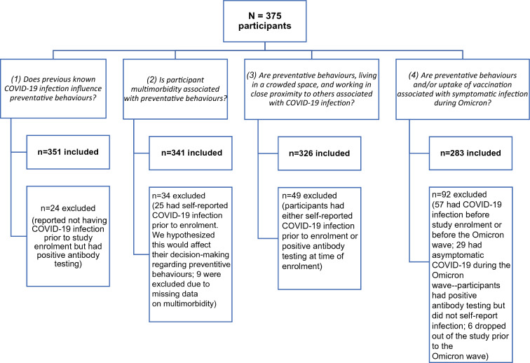 Few studies have examined preventative behaviour practices with respect to COVID-19 among people living with HIV (human immunodeficiency virus). Using a cross-sectional survey from a Canadian Institutes of Health Research Canadian HIV Trials Network study (CTN 328) of people living with HIV on vaccine immunogenicity, we examined the relationships between participant characteristics and behavioural practices intended to prevent COVID-19 infection. Participants living in four Canadian urban centers were enrolled between April 2021-January 2022, at which time they responded to a questionnaire on preventative behaviour practices. Questionnaire and clinical data were combined to explore relationships between preventive behaviours and (1) known COVID-19 infection pre-enrolment, (2) multimorbidity, (3) developing symptomatic COVID-19 infection, and (4) developing symptomatic COVID-19 infection during the Omicron wave. Among 375 participants, 49 had COVID-19 infection pre-enrolment and 88 post-enrolment. The proportion of participants reporting always engaging in preventative behaviours included 87% masking, 79% physical distancing, 70% limiting social gatherings, 65% limiting contact with at-risk individuals, 33% self-isolating due to symptoms, and 26% self-quarantining after possible exposure. Participants with known COVID-19 infection pre-enrolment were more likely to self-quarantine after possible exposure although asymptomatic (65.0% vs 23.4%, p < 0.001; Chi-square test). Participants with multiple comorbidities more likely endorsed physical distancing (85.7% vs 75.5%, p = 0.044; Chi-square test), although this was not significant in logistic regression analysis adjusted for age, sex, race, number of household members, number of bedrooms/bathrooms in the household per person, influenza immunization, and working in close physical proximity to others. Overall, participants reported frequent practice of preventative behaviours.