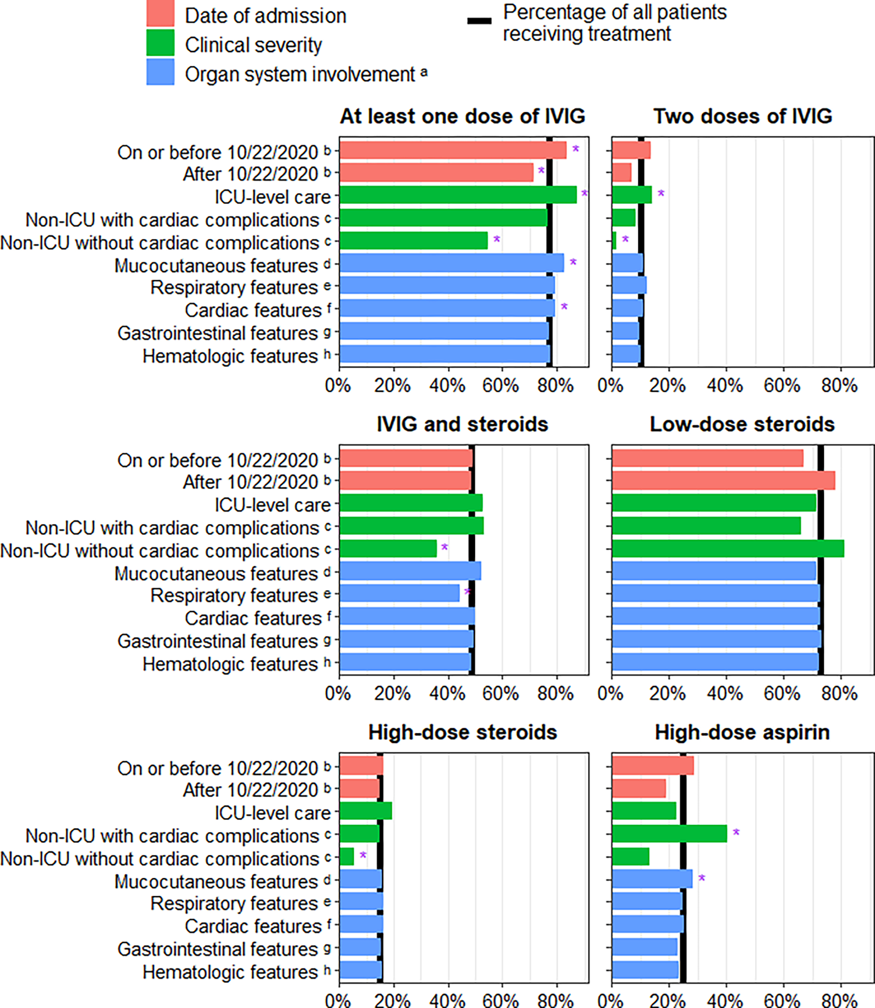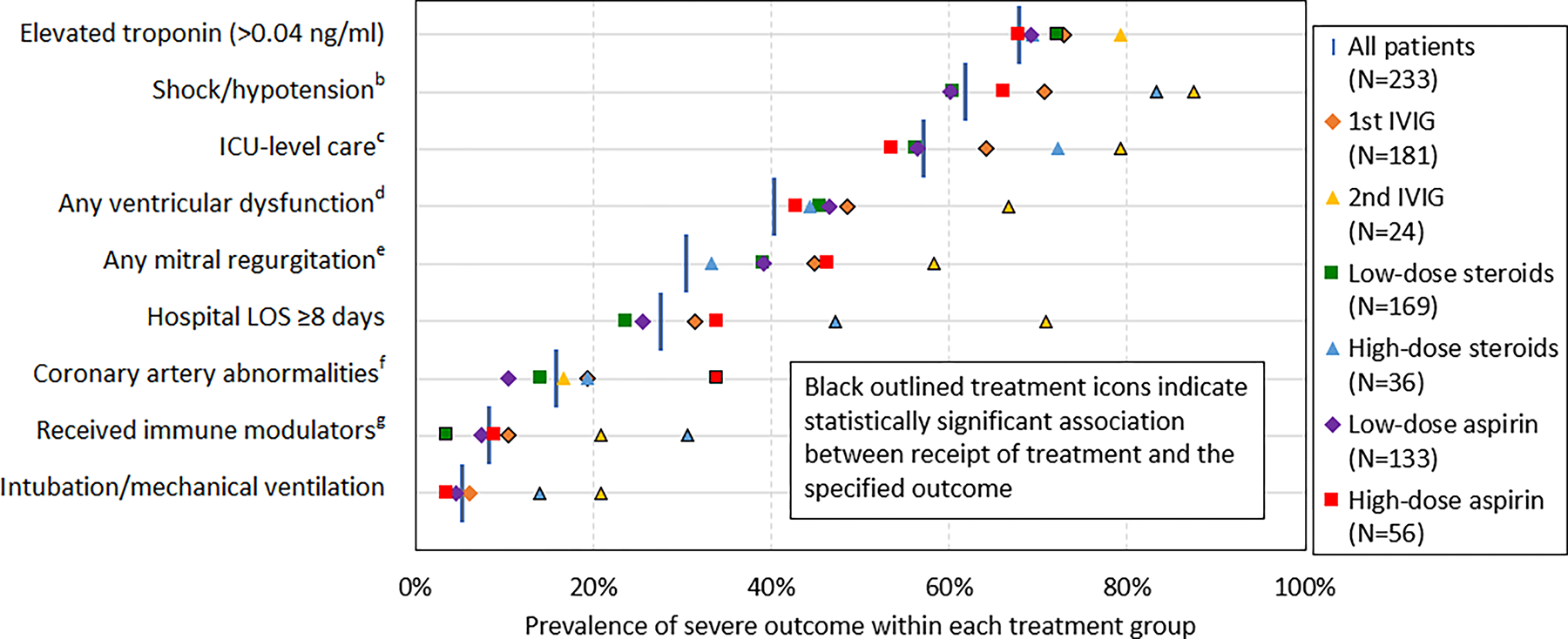 Results: Of 233 patients diagnosed with MIS-C, the most commonly administered treatments were steroids (88.4%), aspirin (81.1%), IVIG (77.7%) and anticoagulants (71.2%). Compared with those patients without respiratory features, patients with respiratory features were less likely to receive IVIG and steroids on the same day (combination treatment) (44.1%). Controlling for confounding variables, patients receiving IVIG within 1 day of hospitalization were less likely to have hospital length of stay ≥8 days (RR = 0.53, 95% CI: 0.31-0.88). Patients receiving low-dose steroids within 1 day of hospitalization were less likely to develop ventricular dysfunction (RR = 0.45, 95% CI: 0.26-0.77), have increasingly elevated troponin levels (RR = 0.55, 95% CI: 0.40-0.75) or have hospital length of stay ≥8 days (RR = 0.46, 95% CI: 0.29-0.74).