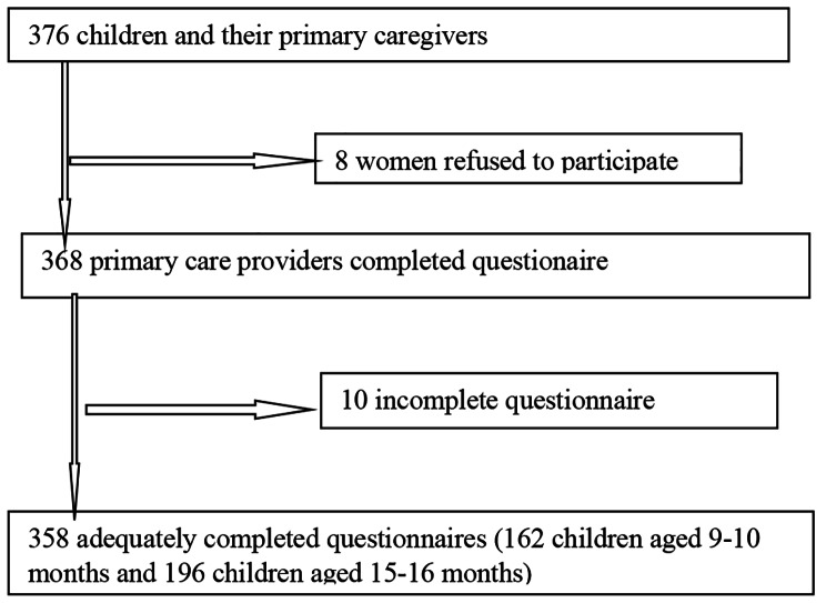 Methods: A cross-sectional study was conducted in Rwanda from August to November 2019. A convenience sample of 376 Rwandan parents/caregivers and their children attending urban health centers for their routine immunization visits at 9 and 15 months of age was studied. Parents/caregivers completed the official Kinyarwandan version of the Ages and Stages Questionnaire (ASQ-3) and established cutoffs were used to identify DD. Frequency and percentages were used to summarise the data. Logistic regression analysis was used to identify factors associated with DD.