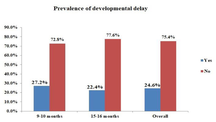 Results: Of the 358 children screened using the ASQ-3, the overall prevalence of DD was 24.6%, with a 27.2% prevalence among 9-10-month old children and 22.4% prevalence among 15-16-month old children. Delays in the combined group among the domains of gross motor, communication, fine motor, personal social, and problem solving were 12.8%, 2.5%, 8.4%, 1.7% and 7.5%, respectively. Gestational age at delivery and district of origin were most highly associated with DD, with preterm children at significantly higher risk of having DD compared to term children (Adjusted Odd Ratio AOR = 8.3; 95% CI = 2.5-27.4) and children from Nyarugenge District at high risk of DD compared to children from Gasabo district (AOR = 2.15; 95% CI = 1.2-3.9).