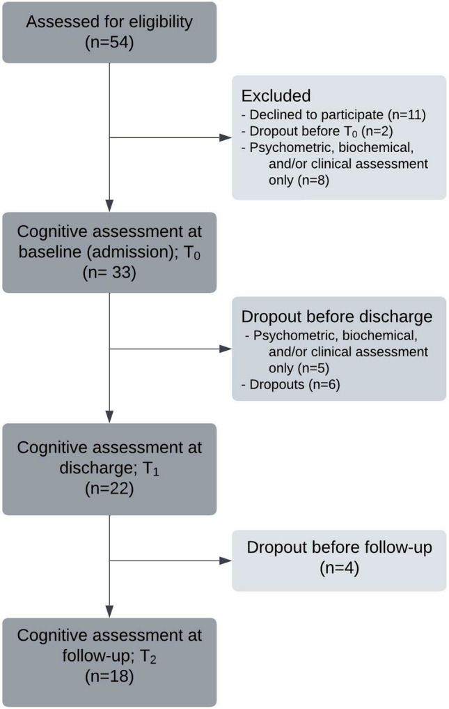 Methods: A few days after admission to a specialized hospital unit, 33 patients with severe or extreme AN, aged 16-42 years, completed assessments of memory, cognitive flexibility, processing speed, and attention. Mean hospitalization was 6 weeks. Patients completed the same assessments at discharge (n = 22) following somatic stabilization and follow-up up to 6 months after discharge (n = 18).