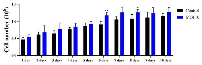 Telomere and telomerase are crucial factors in cell division and chromosome stability. Telomerase activity in most cells depends on the transcription control by the telomerase reverse transcriptase (TERT). The introduction of an exogenous human TERT (hTERT) in cultured cells could enhance telomerase activity and elongate the lifespan of various cells. Telomere elongation mechanisms vary between insects and are complex and unusual. Whether the use of exogenous hTERT can immortalize primary insect cells remains to be investigated. In this study, we used a recombinant virus expressing hTERT to infect primary cultured cells of Periplaneta americana and evaluated its effects on insect cell immortalization. We found that hTERT was successfully expressed and promoted the growth of P. americana cells, shortening their doubling time. This was due to the ability of hTERT to increase the activity of telomerase in P. americana cells, thus prolonging the telomeres. Our study lays the foundation for understanding the mechanisms of telomere elongation in P. americana, and suggests that the introduction of hTERT into insect cells could be an efficient way to establish certain insect cell lines.