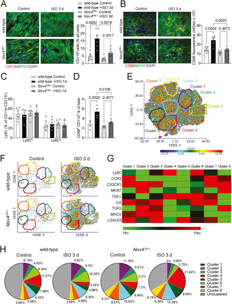 In acute sympathetic stress, catecholamine overload can lead to stress cardiomyopathy. We tested the hypothesis that cardiomyocyte NOX4 (NADPH oxidase 4)-dependent mitochondrial oxidative stress mediates inflammation and diastolic dysfunction in stress cardiomyopathy. Isoproterenol (ISO; 5 mg/kg) injection induced sympathetic stress in wild-type and cardiomyocyte (CM)-specific Nox4 knockout (Nox4CM-/-) mice. Wild-type mice treated with ISO showed higher CM NOX4 expression, H2O2 levels, inflammasome activation, and IL18, IL6, CCL2, and TNFα levels than Nox4CM-/- mice. Spectral flow cytometry and t-SNE analysis of cardiac cell suspensions showed significant increases in pro-inflammatory and pro-fibrotic embryonic-derived resident (CCR2-MHCIIhiCX3CR1hi) macrophages in wild-type mice 3 days after ISO treatment, whereas Nox4CM-/- mice had a higher proportion of embryonic-derived resident tissue-repair (CCR2-MHCIIloCX3CR1lo) macrophages. A significant increase in cardiac fibroblast activation and interstitial collagen deposition and a restrictive pattern of diastolic dysfunction with increased filling pressure was observed in wild-type hearts compared with Nox4CM-/- 7 days post-ISO. A selective NOX4 inhibitor, GKT137831, reduced myocardial mitochondrial ROS, macrophage infiltration, and fibrosis in ISO-injected wild-type mice, and preserved diastolic function. Our data suggest sympathetic overstimulation induces resident macrophage (CCR2-MHCII+) activation and myocardial inflammation, resulting in fibrosis and impaired diastolic function mediated by CM NOX4-dependent ROS.