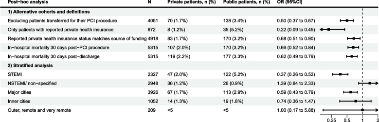 Conclusion: Our findings suggest patients undergoing PCI in Australian public hospitals with private health insurance experience lower in-hospital mortality compared with their publicly insured counterparts, but in-hospital complications are not related to patient health insurance status. Our findings are likely due to unmeasured confounding of broader patient selection, socioeconomic differences and pathways of care (e.g. access to emergency and ambulatory care; delays in treatment) that should be investigated to improve equity in health outcomes.