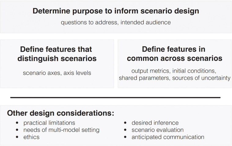 Across many fields, scenario modeling has become an important tool for exploring long-term projections and how they might depend on potential interventions and critical uncertainties, with relevance to both decision makers and scientists. In the past decade, and especially during the COVID-19 pandemic, the field of epidemiology has seen substantial growth in the use of scenario projections. Multiple scenarios are often projected at the same time, allowing important comparisons that can guide the choice of intervention, the prioritization of research topics, or public communication. The design of the scenarios is central to their ability to inform important questions. In this paper, we draw on the fields of decision analysis and statistical design of experiments to propose a framework for scenario design in epidemiology, with relevance also to other fields. We identify six different fundamental purposes for scenario designs (decision making, sensitivity analysis, value of information, situational awareness, horizon scanning, and forecasting) and discuss how those purposes guide the structure of scenarios. We discuss other aspects of the content and process of scenario design, broadly for all settings and specifically for multi-model ensemble projections. As an illustrative case study, we examine the first 17 rounds of scenarios from the U.S. COVID-19 Scenario Modeling Hub, then reflect on future advancements that could improve the design of scenarios in epidemiological settings.