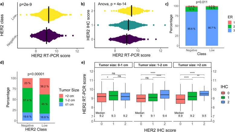 Results: HER2-low cases exhibited significantly higher HER2 RT-PCR scores (p = 2.1e-9), elevated estrogen receptor (ER) levels (p = 0.0114), and larger tumor sizes compared to HER2-0 cases (> 2 cm; 36.6% vs. 22.1%, respectively, p < 0.00001). Primary tumors > 2 cm were more likely to be HER2-low (OR = 2.07, 95% CI: 1.6317 to 2.6475, p < 0.0001). Metastatic BCs expressed higher HER2 IHC scores compared with primary BCs (Wilcoxon signed-rank, p = 0.046). HER2 IHC scores were higher for low-risk vs. medium-risk OncotypeDX (p = 0.0067). No other clinical or pathological parameters were associated with the increase in HER2 levels in the metastatic samples.