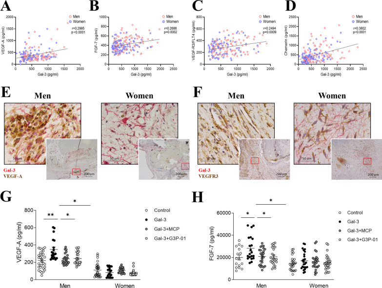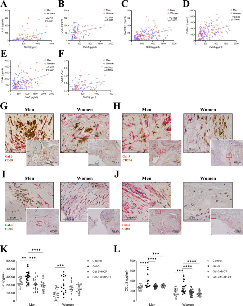 Results: Proteomic analysis revealed that intracellular Gal-3 was over-expressed in VICs of male AS patients. Gal-3 secretion was also higher in men's VICs as compared to women's. In human AVs, Gal-3 protein levels were significantly higher in men, with stronger immunostaining in VICs with myofibroblastic phenotype and valve endothelial cells. Gal-3 levels in AVs were positively correlated with inflammatory markers in both sexes. Gal-3 expression was also positively correlated with osteogenic markers mainly in men AVs, and with angiogenic molecules only in this sex. In vitro, Gal-3 treatment induced expression of inflammatory, osteogenic and angiogenic markers in male's VICs, while it only upregulated inflammatory and osteogenic molecules in women-derived cells. Gal-3 blockade with pharmacological inhibitors (modified citrus pectin and G3P-01) prevented the upregulation of inflammatory, osteogenic and angiogenic molecules.