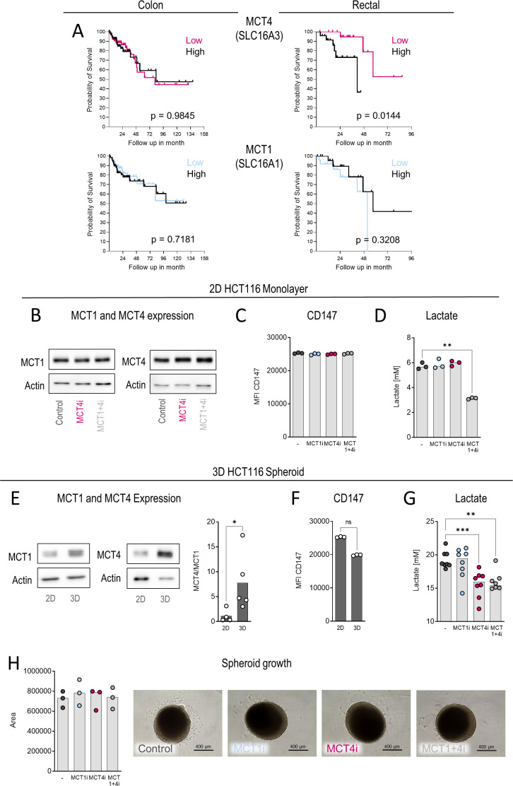 Results: Inhibition of MCT4 was sufficient to reduce lactate efflux in three-dimensional (3D) CRC spheroids but not in two-dimensional cell-cultures. Co-administration of the MCT4 inhibitor and ICB augmented immune cell infiltration, T-cell function and decreased CRC spheroid viability in a 3D co-culture model of human CRC spheroids with blood leukocytes. Accordingly, combination of MCT4 and ICB increased intratumoral pH, improved leukocyte infiltration and T-cell activation, delayed tumor growth, and prolonged survival in vivo. MCT1 inhibition exerted no further beneficial impact.