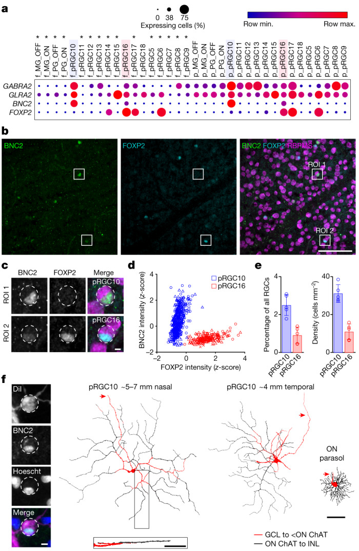 To maintain a stable and clear image of the world, our eyes reflexively follow the direction in which a visual scene is moving. Such gaze-stabilization mechanisms reduce image blur as we move in the environment. In non-primate mammals, this behaviour is initiated by retinal output neurons called ON-type direction-selective ganglion cells (ON-DSGCs), which detect the direction of image motion and transmit signals to brainstem nuclei that drive compensatory eye movements1. However, ON-DSGCs have not yet been identified in the retina of primates, raising the possibility that this reflex is mediated by cortical visual areas. Here we mined single-cell RNA transcriptomic data from primate retina to identify a candidate ON-DSGC. We then combined two-photon calcium imaging, molecular identification and morphological analysis to reveal a population of ON-DSGCs in the macaque retina. The morphology, molecular signature and GABA (γ-aminobutyric acid)-dependent mechanisms that underlie direction selectivity in primate ON-DSGCs are highly conserved with those in other mammals. We further identify a candidate ON-DSGC in human retina. The presence of ON-DSGCs in primates highlights the need to examine the contribution of subcortical retinal mechanisms to normal and aberrant gaze stabilization in the developing and mature visual system.