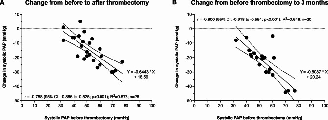 Results: Twenty-nine patients (34% female) underwent mechanical thrombectomy, of which 20 completed three months follow-up with right heart catheterization. Most patients were at high (17%) or intermediate-high (76%) risk and had bilateral PE (79%). Before thrombectomy, systolic PAP (sPAP) was severely elevated (mean 51.3 ± 11.6 mmHg). Mean sPAP dropped by -15.0 mmHg (95% confidence interval [CI]: -18.9 to -11.0; p < 0.001) immediately after the procedure and continued to decrease from post-thrombectomy to three months (-6.4 mmHg, 95% CI: -10-0 to -2.9; p = 0.002). RV/left ventricular (LV) ratio immediately reduced within two days by -0.37 (95% CI: -0.47 to -0.27; p < 0.001). The proportion of patients with a tricuspid annular plane systolic excursion (TAPSE)/sPAP ratio < 0.31 mm/mmHg decreased from 28% at baseline to 0% before discharge and at three months (p = 0.007). There were no procedure-related major adverse events.