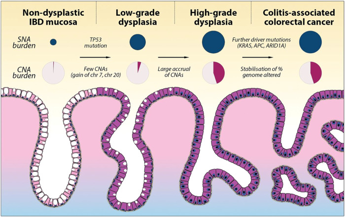 Sustained chronic inflammation of the large intestine leads to tissue damage and repair, which is associated with an increased incidence of colitis-associated colorectal cancer (CAC). The genetic makeup of CAC is somewhat similar to sporadic colorectal carcinoma (sCRC), but there are differences in the sequence and timing of alterations in the carcinogenesis process. Several models have been developed to explain the development of CAC, particularly the "field cancerization" model, which proposes that chronic inflammation accelerates mutagenesis and selects for the clonal expansion of phenotypically normal, pro-tumorigenic cells. In contrast, the "Big Bang" model posits that tumorigenic clones with multiple driver gene mutations emerge spontaneously. The details of CAC tumorigenesis-and how they differ from sCRC-are not yet fully understood. In this Review, we discuss recent genetic, epigenetic, and environmental findings related to CAC pathogenesis in the past five years, with a focus on unbiased, high-resolution genetic profiling of non-dysplastic field cancerization in the context of inflammatory bowel disease (IBD).