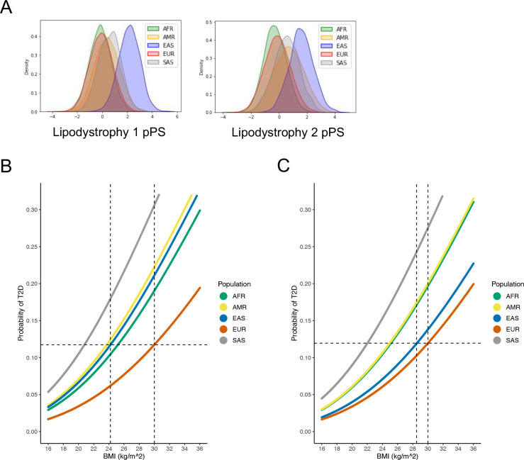 We identified genetic subtypes of type 2 diabetes (T2D) by analyzing genetic data from diverse groups, including non-European populations. We implemented soft clustering with 650 T2D-associated genetic variants, capturing known and novel T2D subtypes with distinct cardiometabolic trait associations. The twelve genetic clusters were distinctively enriched for single-cell regulatory regions. Polygenic scores derived from the clusters differed in distribution between ancestry groups, including a significantly higher proportion of lipodystrophy-related polygenic risk in East Asian ancestry. T2D risk was equivalent at a BMI of 30 kg/m2 in the European subpopulation and 24.2 (22.9-25.5) kg/m2 in the East Asian subpopulation; after adjusting for cluster-specific genetic risk, the equivalent BMI threshold increased to 28.5 (27.1-30.0) kg/m2 in the East Asian group, explaining about 75% of the difference in BMI thresholds. Thus, these multi-ancestry T2D genetic subtypes encompass a broader range of biological mechanisms and help explain ancestry-associated differences in T2D risk profiles.