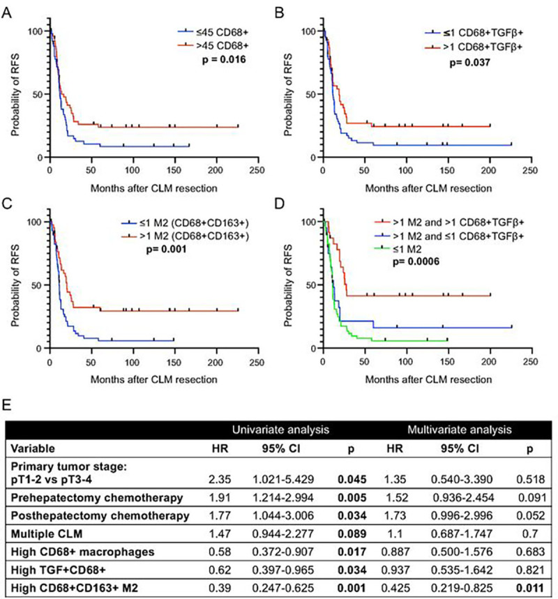 Results: CLM exhibited M2 macrophage polarization, and helper T cells were the prevalent adaptive T cell subtype. The density of total, M2 and TGFβ-expressing macrophages, and regulatory T cells was lower in CLM treated with preoperative chemotherapy. CLM with right-sided primary demonstrated enrichment of TGFβ-expressing macrophages, and with left-sided primary had higher densities of helper and cytotoxic T cells. In multivariate analysis, high density of M2 macrophages correlated with longer recurrence-free survival (RFS) in the entire cohort [hazard ratio (HR) 0.425, 95% CI 0.219-0.825, p=0.011) and in patients without preoperative chemotherapy (HR 0.45, 95% CI 0.221-0.932, p=0.032). High pSMAD3-expressing macrophages were associated with shorter RFS in CLM after preoperative chemotherapy.