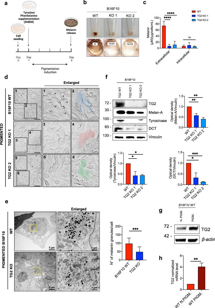 Skin cutaneous melanoma (SKCM) is the deadliest form of skin cancer due to its high heterogeneity that drives tumor aggressiveness. Melanoma plasticity consists of two distinct phenotypic states that co-exist in the tumor niche, the proliferative and the invasive, respectively associated with a high and low expression of MITF, the master regulator of melanocyte lineage. However, despite efforts, melanoma research is still far from exhaustively dissecting this phenomenon. Here, we discovered a key function of Transglutaminase Type-2 (TG2) in regulating melanogenesis by modulating MITF transcription factor expression and its transcriptional activity. Importantly, we demonstrated that TG2 expression affects melanoma invasiveness, highlighting its positive value in SKCM. These results suggest that TG2 may have implications in the regulation of the phenotype switching by promoting melanoma differentiation and impairing its metastatic potential. Our findings offer potential perspectives to unravel melanoma vulnerabilities via tuning intra-tumor heterogeneity.