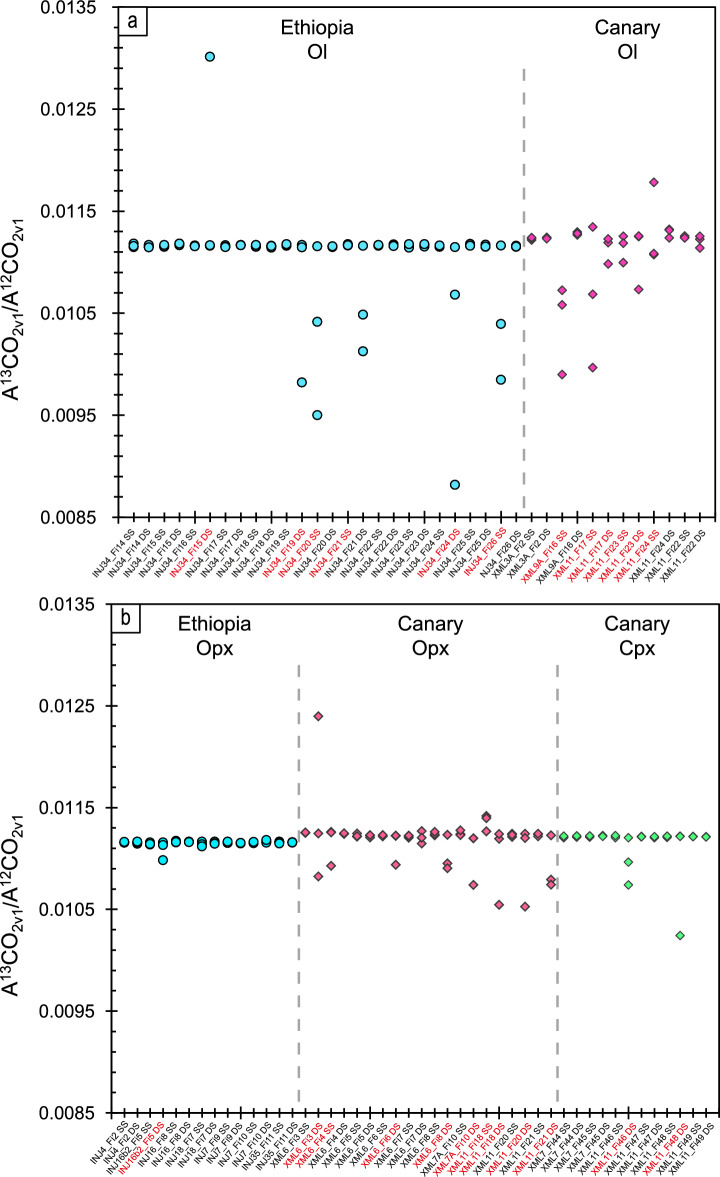 Measuring the carbon stable isotope ratio (13C/12C, expressed as δ13CCO2) in geogenic CO2 fluids is a crucial geochemical tool for studying Earth's degassing. Carbon stable isotope analysis is traditionally performed by bulk mass spectrometry. Although Raman spectroscopy distinguishes 12CO2 and 13CO2 isotopologue bands in spectra, using this technique to determine CO2 isotopic signature has been challenging. Here, we report on in-situ non-destructive analyses of the C stable isotopic composition of CO2, applying a novel high-resolution Raman configuration on 42 high-density CO2 fluid inclusions in mantle rocks from the Lake Tana region (Ethiopia) and El Hierro (Canary Islands). We collected two sets of three spectra with different acquisition times at high spectral resolution in each fluid inclusion. Among the 84 sets of spectra, 58 were characterised by integrated 13CO2/12CO2 band area ratios with reproducibility better than 4‰. Our results demonstrate the determination of δ13CCO2 by Raman spectroscopy in individual fluid inclusions with an error better than 2.5 ‰, which satisfactorily matches bulk mass spectrometry analyses in the same rock samples, supporting the accuracy of the measurements. We thus show that Raman Spectroscopy can provide a fundamental methodology for non-destructive, site-specific, and spatially resolved carbon isotope labelling at the microscale.