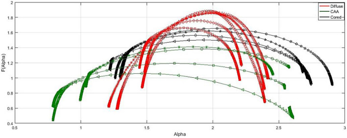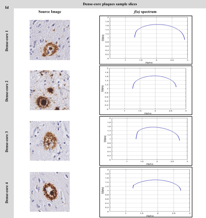 Alzheimer's disease (AD) is a physical illness, which damages a person's brain; it is the most common cause of dementia. AD can be characterized by the formation of amyloid-beta (Aβ) deposits. They exhibit diverse morphologies that range from diffuse to dense-core plaques. Most of the histological images cannot be described precisely by traditional geometry or methods. Therefore, this study aims to employ multifractal geometry in assessing and classifying amyloid plaque morphologies. The classification process is based on extracting the most descriptive features related to the amyloid-beta (Aβ) deposits using the Naive Bayes classifier. To eliminate the less important features, the Random Forest algorithm has been used. The proposed methodology has achieved an accuracy of 99%, sensitivity of 100%, and specificity of 98.5%. This study employed a new dataset that had not been widely used before.