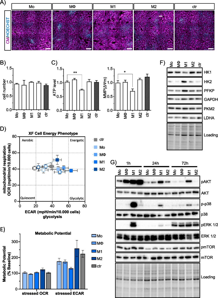 Methods: We examined CD45-/CD31-/CD34+ preadipocytes and CD68+ macrophages in human granulation tissue from pressure ulcers (n=6) using immunofluorescence, immunohistochemistry, and flow cytometry. In vitro, we studied macrophage-preadipocyte interactions using primary human adipose-derived stem cells (ASCs) exposed to conditioned medium harvested from IFNG/LPS (M1)- or IL4/IL13 (M2)-activated macrophages. Macrophages were derived from THP1 cells or CD14+ monocytes. In addition to confocal microscopy and flow cytometry, ASCs were analyzed for metabolic (OXPHOS, glycolysis), morphological (cytoskeleton), and mitochondrial (ATP production, membrane potential) changes. Angiogenic properties of ASCs were determined by HUVEC-based angiogenesis assay. Protein and mRNA levels were assessed by immunoblotting and quantitative RT-PCR.
