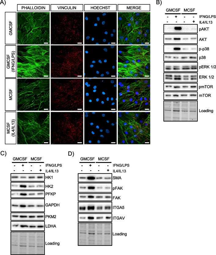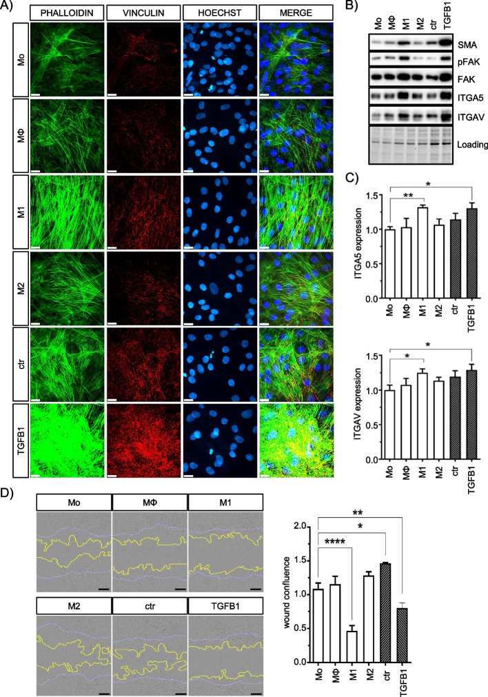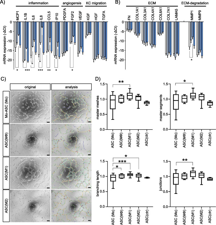 Results: CD45-/CD31-/CD34+ preadipocytes were observed with a prevalence of up to 1.5% of total viable cells in human granulation tissue. Immunofluorescence staining suggested a spatial proximity of these cells to CD68+ macrophages in vivo. In vitro, ASCs exposed to M1, but not to M2 macrophage secretome showed a pro-fibrotic response characterized by stress fiber formation, elevated alpha smooth muscle actin (SMA), and increased expression of integrins ITGA5 and ITGAV. Macrophage-secreted IL1B and TGFB1 mediated this response via the PI3K/AKT and p38-MAPK pathways. In addition, ASCs exposed to M1-inflammatory stress demonstrated reduced migration, switched to a glycolysis-dominated metabolism with reduced ATP production, and increased levels of inflammatory cytokines such as IL1B, IL8, and MCP1. Notably, M1 but not M2 macrophages enhanced the angiogenic potential of ASCs.