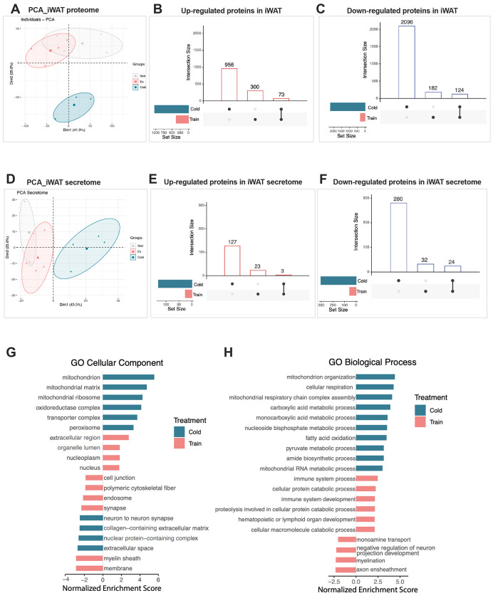 Exercise training and cold exposure both improve systemic metabolism, but the mechanisms are not well-established. We tested the hypothesis that adaptations to inguinal white adipose tissue (iWAT) are critical for these beneficial effects by determining the impact of exercise-trained and cold-exposed iWAT on systemic glucose metabolism and the iWAT proteome and secretome. Transplanting trained iWAT into sedentary mice improved glucose tolerance, while cold-exposed iWAT transplantation showed no such benefit. Compared to training, cold led to more pronounced alterations in the iWAT proteome and secretome, downregulating >2,000 proteins but also boosting iWAT's thermogenic capacity. In contrast, only training increased extracellular space and vesicle transport proteins, and only training upregulated proteins that correlate with favorable fasting glucose, suggesting fundamental changes in trained iWAT that mediate tissue-to-tissue communication. This study defines the unique exercise training- and cold exposure-induced iWAT proteomes, revealing distinct mechanisms for the beneficial effects of these interventions on metabolic health.