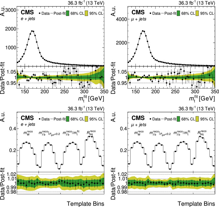 The top quark mass distribution before (upper) and after (lower) the