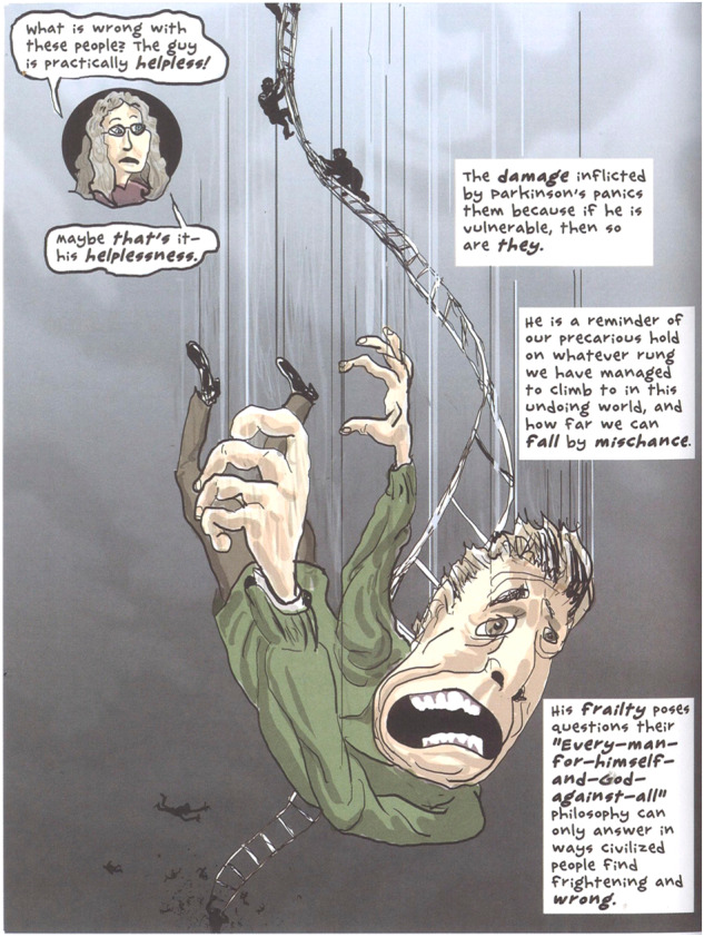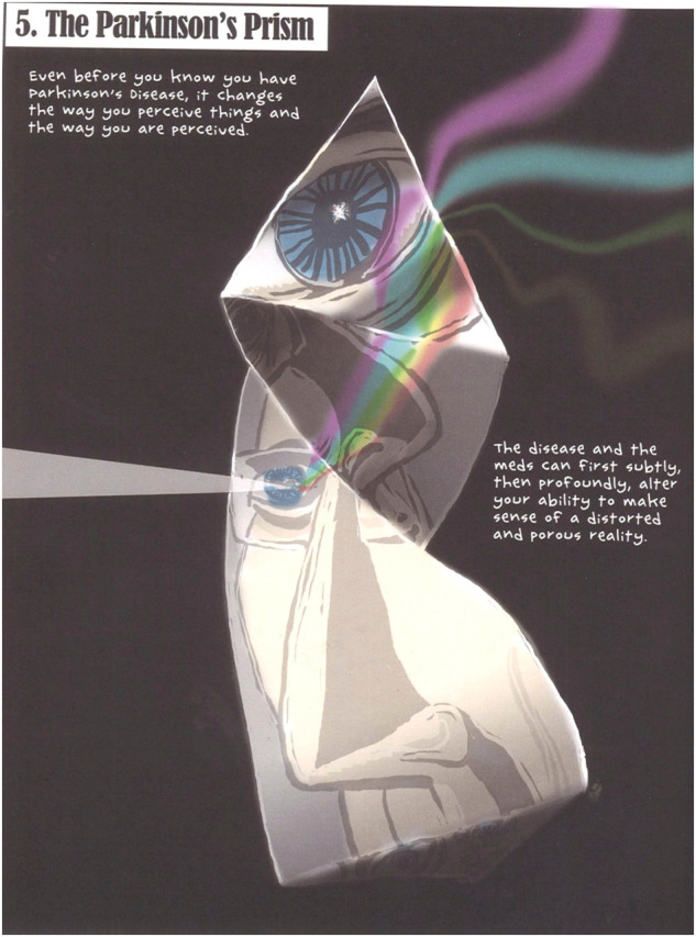 Parkinson's disease characteristics can create a self-perceived sense of stigmatization and disapproval by others, thereby affecting self-perceived autonomy. This study investigated the metaphors related to the loss of autonomy and stigma in stories and drawings of Parkinson's disease. We compare a contemporary first-person illness narrative and -drawing from a person with Parkinson's disease, with two novels (Jonathan Franzen's The Corrections and Claudia Piñeiro's Elena Knows), a graphic novel (Peter Dunlap-Shohl's My Degeneration: A Journey Through Parkinson's), a non-fiction book (Oliver Sacks' Awakenings) and a first-person illness narrative (John Palfreman's The Bright Side of Parkinson's). Metaphors in the patient narrative, novels, and non-fiction work were reviewed and a list of themes or categorizations common to 2 of the metaphors was generated. Parkinson's disease metaphors indicate a 'Parkinson's prism' thereby depicting extreme experiences (24.4%) like a 'fall by mischance', a 'tantrum of selfish misery' or a 'bottomless darkness and unreality' (Table 1). Both novels signify a sense of 'betrayal and disconnection' in the Parkinson's disease experience while non-fiction of Parkinsonism depicts a space in which one feels 'caged and deprived'. This makes the Parkinson's disease narrative a chaos story that could influence the decision to initiate treatment and treatment adherence. We conclude that narrative medicine can help to focus the medical consultations with affected individuals on issues that matter most to them, thereby improving self-perceived autonomy and stigma. As such, it is a critical component of the much-needed move towards personalized medicine in Parkinson's disease, achieved through the reciprocity of thinking with stories.